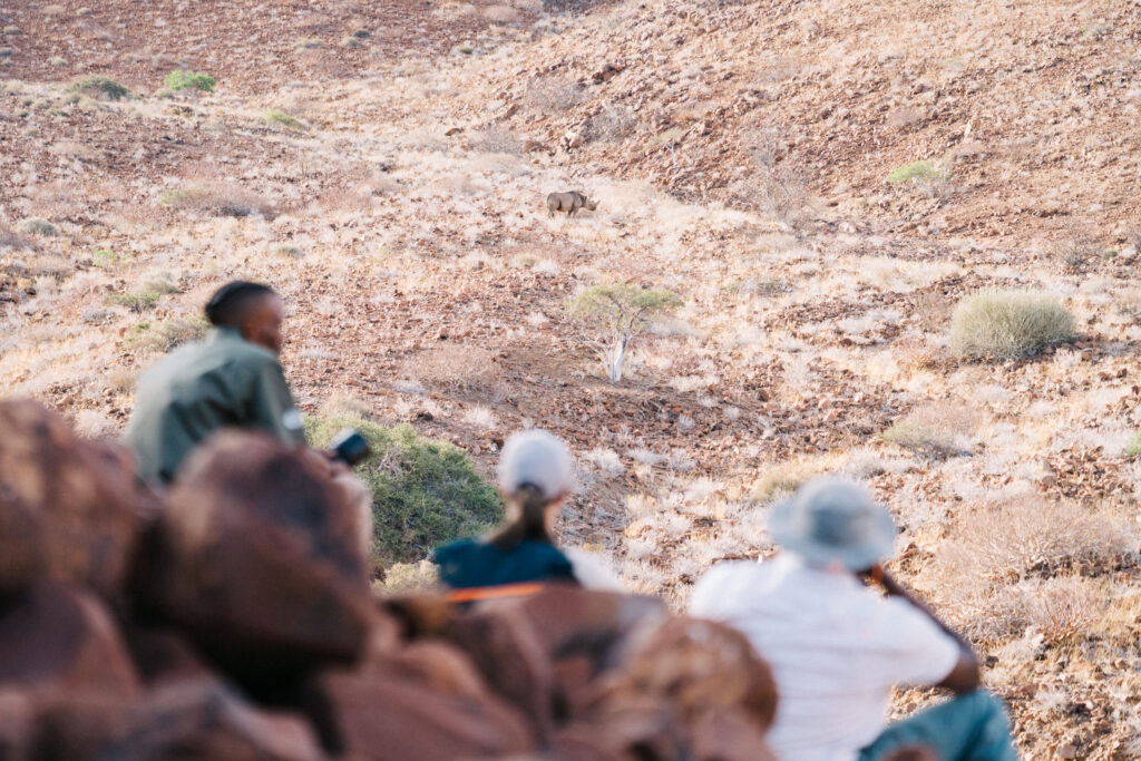 Namibia is the stronghold for the south-western subspecies of black rhino (Diceros bicornis bicornis), and today the country offers arguably the best black rhino viewing in Africa. Tracking endangered black rhino on foot with expert guides from the Save the Rhino Trust is one of Namibia’s most thrilling wildlife experiences. Set amid high basalt hills and rocky desert plains, this beautiful camp offers a rare chance to encounter these desert-adapted rhinos in the wild while directly supporting their protection.