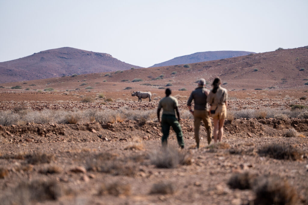 Tracking rhino here isn’t for everyone. You need a good degree of agility to navigate the jagged, rock-strewn landscape (walking boots are highly recommended), the ability to listen carefully and remain quiet, and an acceptance that you are on foot in the realm of an animal far faster and more powerful than you are. Unlike most big-game walks, the trackers and guides carry no rifles. Here, the sweeping open terrain allows long sightlines and gives animals room to retreat, and the wardens’ close familiarity with each rhino means they can take sensible precautions and maintain a safe buffer.